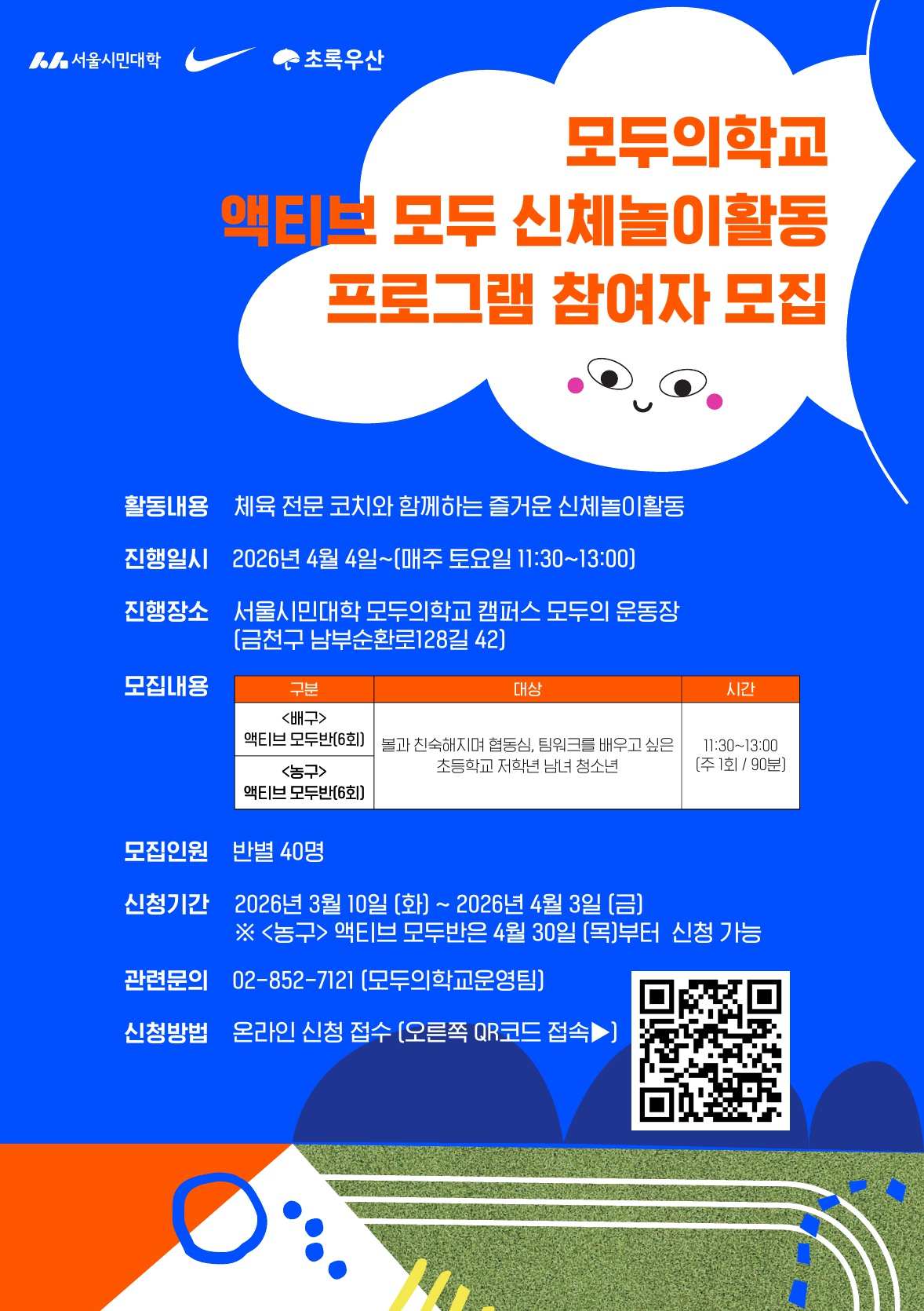 ‹액티브 모두›는 성별, 연령, 신체능력과 관계없이 모든 아이들이 재미있는 신체활동 프로그램을 통해 스포츠에 대한 긍정적인 경험을 하고, 평생의 스포츠 습관을 기르며 건강하게 성장할 수 있도록 지원합니다.
